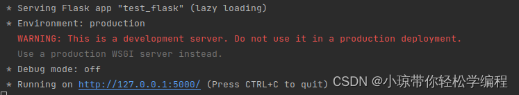 在terminal终端中输入python test_flask.py runserver -r -d(test_flask.py改为自己.py文件的名字,这里值得注意的是.py文件名不能取为flask,这样系统识别不了from flask import Flask)再点击 下图蓝色部分就可以了。