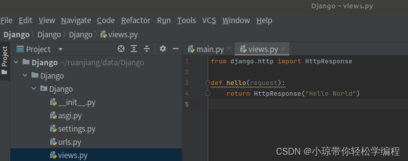 3. 打开项目配置文件urls.py,添加hello视图的URL配置: