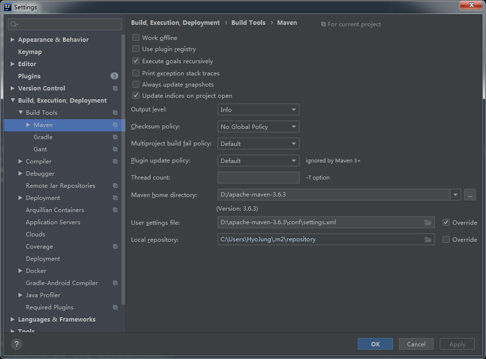 在Settings弹框里面搜索Maven,修改Maven home directory的路径以及User settings file