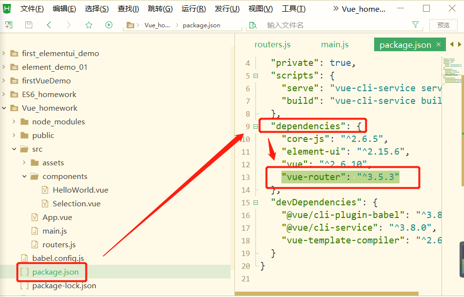2.在package.json文件下的dependencies下加入router的相关配置("vue-router": "^3.5.3"),如下图: