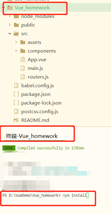 3.打开这个项目的终端,运行npm install,这样vue的router就加载进来了