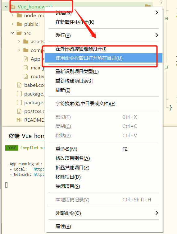 8.打开本项目终端:运行:npm run serve 运行成功后去localhost:8080 访问即可