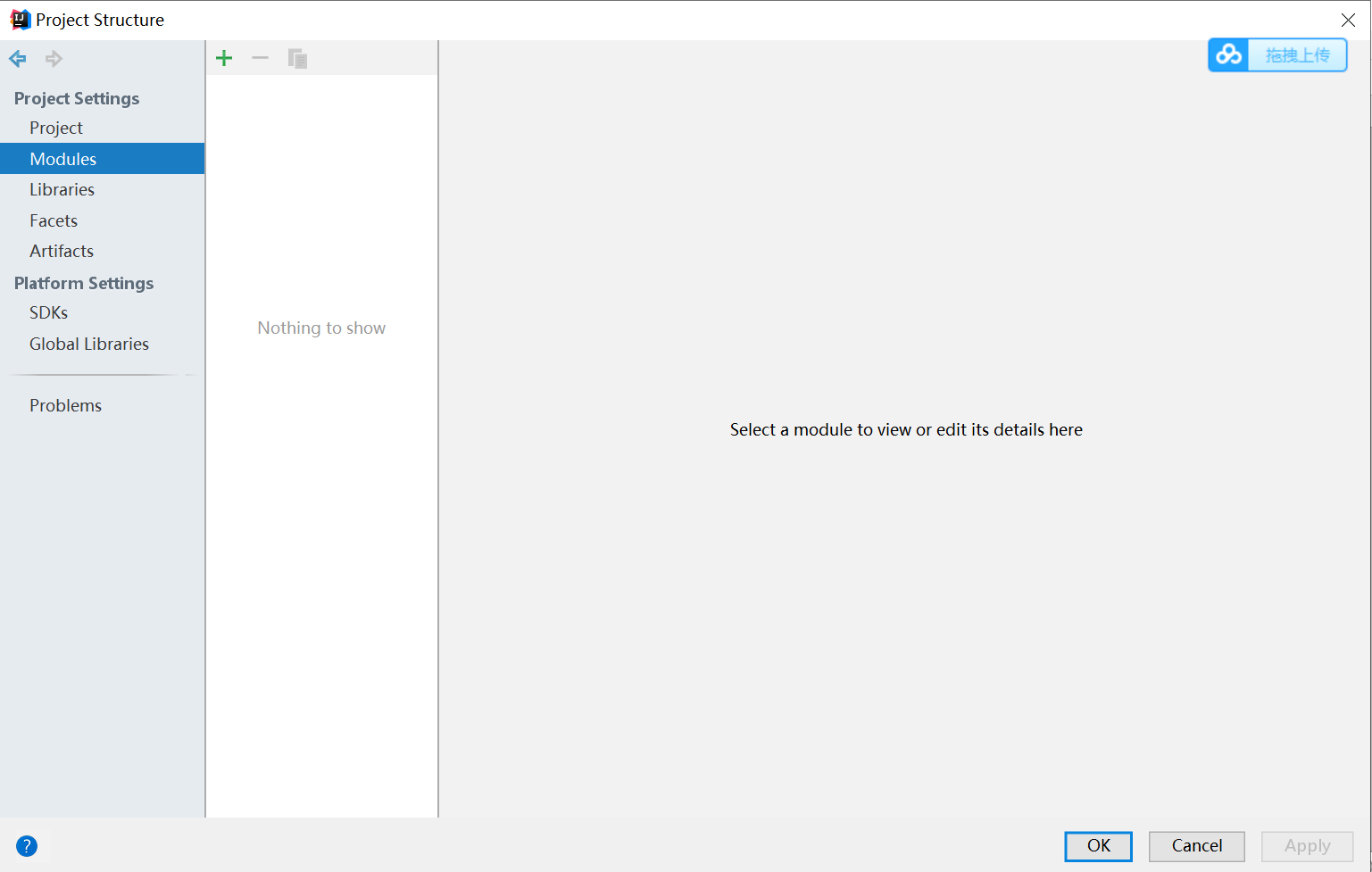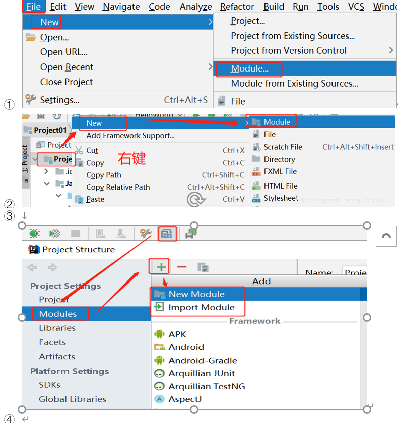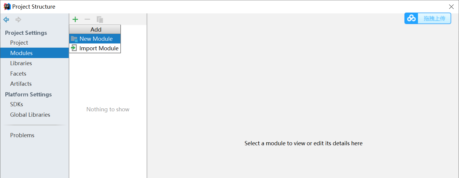 ③打开Project Structure->Modules->选择绿色的+ -> 选择“New Module” 创建