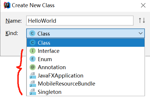 不管是创建 class,还是 interface,还是 annotation,都是选择 new->Java Class,然后在下拉框中选择创建的结构的类型。