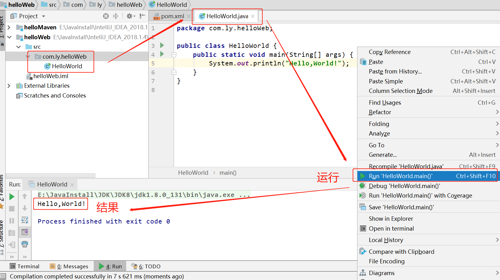 运行程序,在代码编辑区鼠标右键,选择 Run HelloWorld 即可,或在菜单中选择 Run->Run HelloWorld