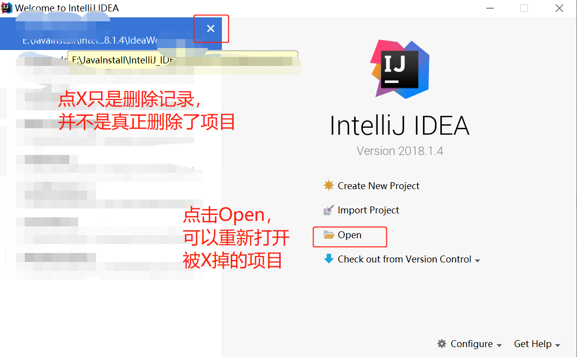 关闭IDEA中已经存在的项目, File->Close Project。这时IDEA回到了启动界面,点击项目上的 X ,IDEA中就没有这个项目了。但这只是删除了记录,如果此时你打开工作域,发现项目还是存在的。