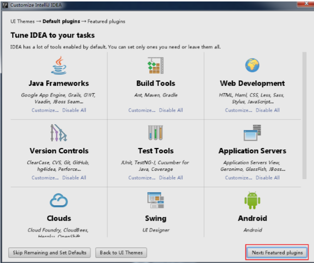 设置 IDEA 中的各种插件,可以选择自定义设置、删除,或者安装本身不存在的插件(比如:支持 Scala 的插件)。这里不设置,后面也可以通过界面菜单栏的 settings 进行设置。