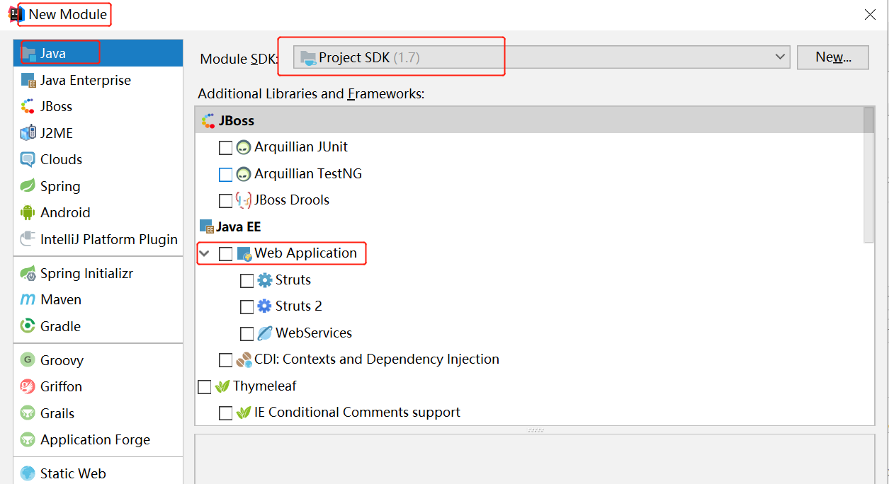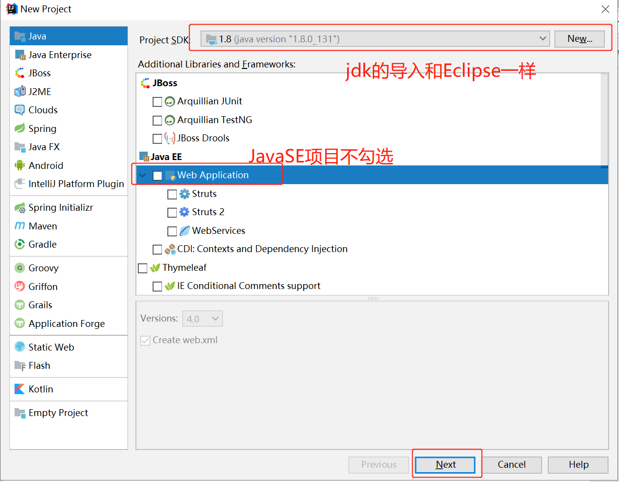 2、在弹出的对话框中,选择 JDK 作为 SDK。如果需要创建 Web 工程,则需要勾选上面的 Web Application。如果不需要创建 Web 工程的话,则不需要勾选。这里先不勾选,只是创建简单的 Java 工程。