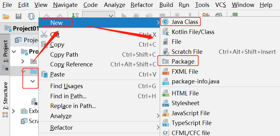 创建包:在源代码目录 src 上,鼠标右键,选择 new->Package ,键入包名, 点击OK。