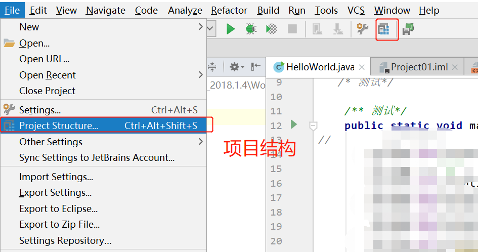 选择 File->Project Structure 或直接点击工具栏按钮,进入项目结构