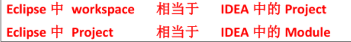 1、在 Eclipse 中我们有 Workspace(工作空间)和 Project(工程)的概念,在 IDEA中只有 Project(工程)和 Module(模块)的概念。这里的对应关系为: