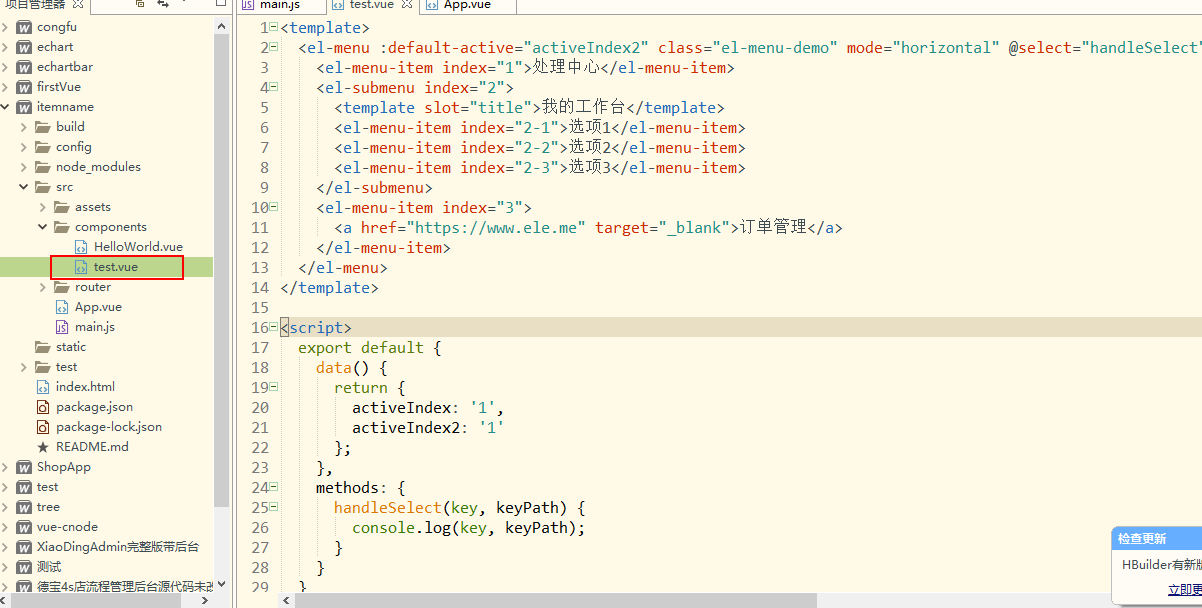7:在components文件夹下面创建test.vue文件,复制一段elementUI官方文档的代码,进行测试