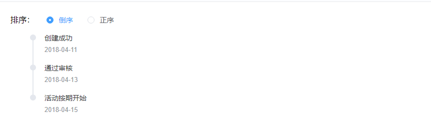 Timeline 可拆分成多个按照时间戳正序或倒序排列的 activity,时间戳是其区分于其他控件的重要特征,使⽤时注意与 Steps 步骤条等区分。