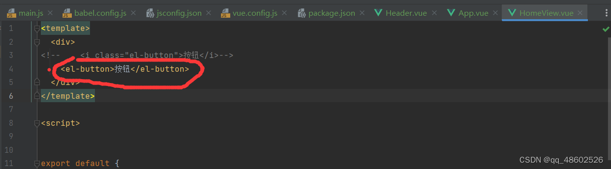 下面是在一个vue组件使用el-button标签来检验是否成功引入element