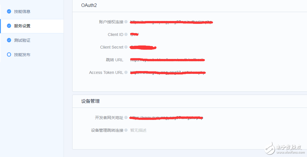 从图中可以看到,用户的语音指令通过天猫精灵上传阿里云语音服务器通过解析后发送响应的协议到第三方设备控制云(前提是要有第三方的授权),然后第三方的云再与用户的设备进行沟通控制。这种控制方式我个人认为是很合理的,首先这是两套独立的系统,只是通过协议对接,相互不相影响,独立性高,安全性高。阿里专注于做语音识别,语义分析等AI方面的事情,而第三方硬件厂商专注于做自己的硬件设备,各归其所,能把产品的性能发挥到极致。 在这再次声明,我的目的是通过使用一定的方法达到我的目的,对于深层次的东西并没有深究,由于涉及的东西过多,文章中如果出现错误,麻烦大神一定批评指正,谢谢。 在正式做之前我们先把这个原理捋一捋,原理清楚了就知道我们要做什么了,下边的一段内容主要是参考天猫精灵的官方开发文档。只截取重点。首先我们要在天猫精灵的开发网站上发布一项智能家居的技能,最关键的是在技能发布的时候的服务设置,这里就明确要求了我们一定要有第三方授权协议的支持Oauth2。