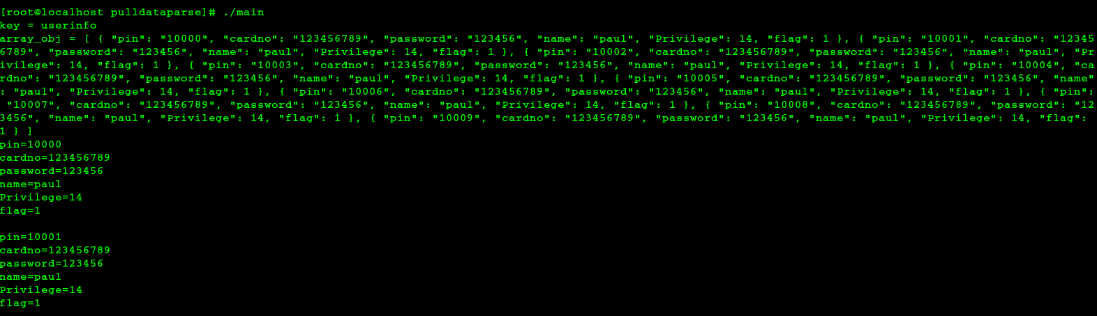 { "pin": "10004", "cardno": "123456789", "password": "123456", "name": "paul", "Privilege": 14, "flag": 1 }, n