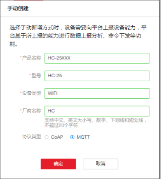 下面进行设备注册,选择刚才注册的产品,填写以下信息,按确定: