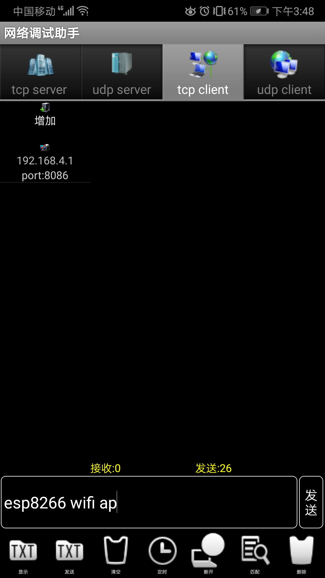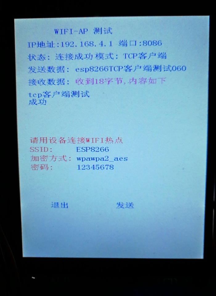 当开发板选择进入“TCP客户端”后,需要输入手机的ip地址,输入完连接手机成功后,进入图下的画面。