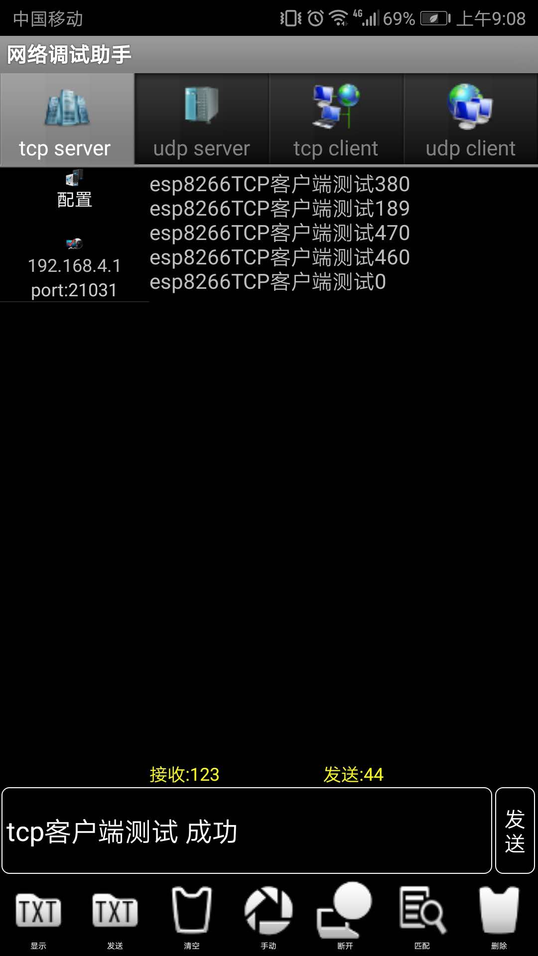 手机打开网络调试助手,选择tcp server,点击配置,设备端口为“8086”(程序设定的)。激活成功后,可看到手机的ip地址