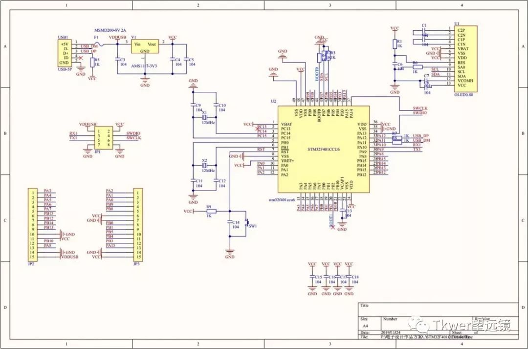 主控是STM32F401CCU6,外围电路包含32.768KHZ的RTC晶振以及8MHZ高速外部晶振。板上资源有一个复位按键、一个用户LED、一个OLED显示、还提供了集USB通讯供电为一体的Micro-USB接口、SWD调试接口和串口引出。剩余所有GPIO接口以IIC,SPI等通用接口顺序引出。