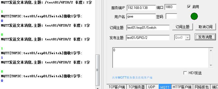 5.发布控制命令的主题为 test01/GPIO/2 ,