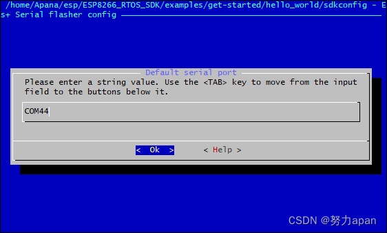 进入Serial flasher config目录,选择Default serial port,输入串口号(自行查询串口号)