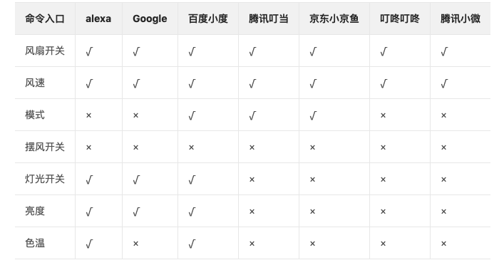 目前公版风扇支持的语音平台参考下表: √——支持 ×——暂不支持