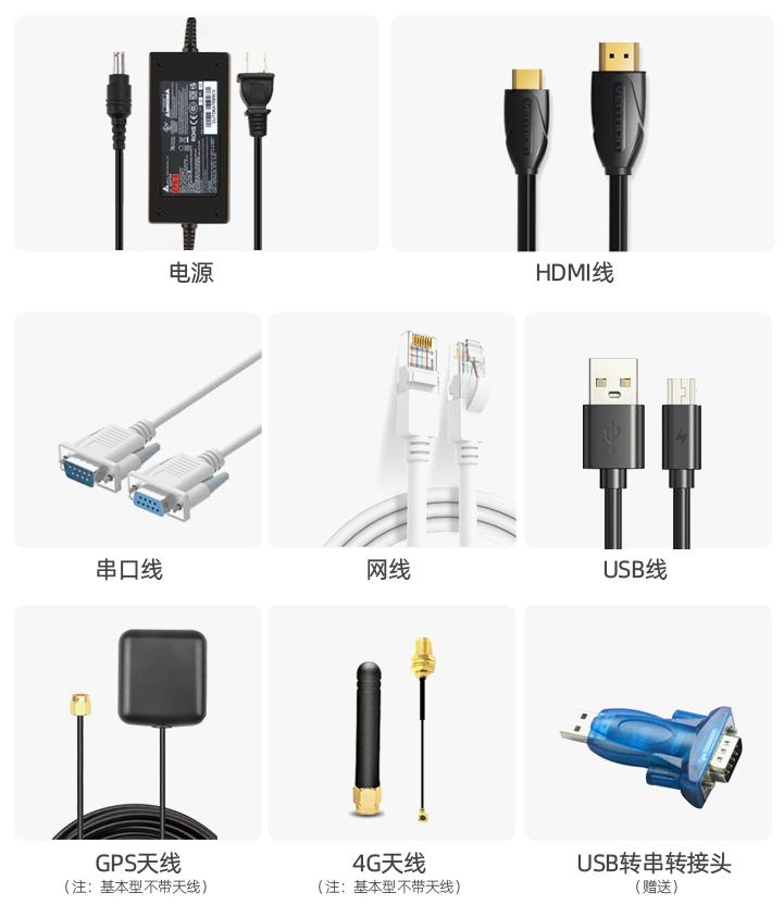 开发板 x 1个、电源 x 1个、HDMI线 x 1个、串口线 x 1个、网线 x 1个、USB线 x 1个、4G天线(基本型不带天线) x 1个、 GPS天线(基本型不带天线) x 1个、USB转串转接头 x 1个