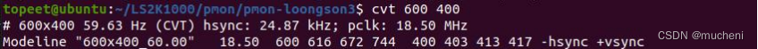 如果您要添加一个自己分辨率,比如 600x400,其他参数您可以在 Ubuntu 的电脑终端输入命令 cvt 600400 来自动获取的。如下图所示: