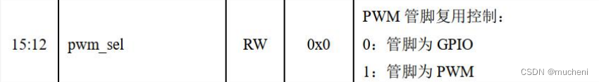 其中定 19 行代码*(volatile int *)0xbfe10420 |=(1<<12);是将 GPIO 设置成 PWM0 功能,地址 0xbfe10420的第 12 位对应的是 PWM0,如下图所示: