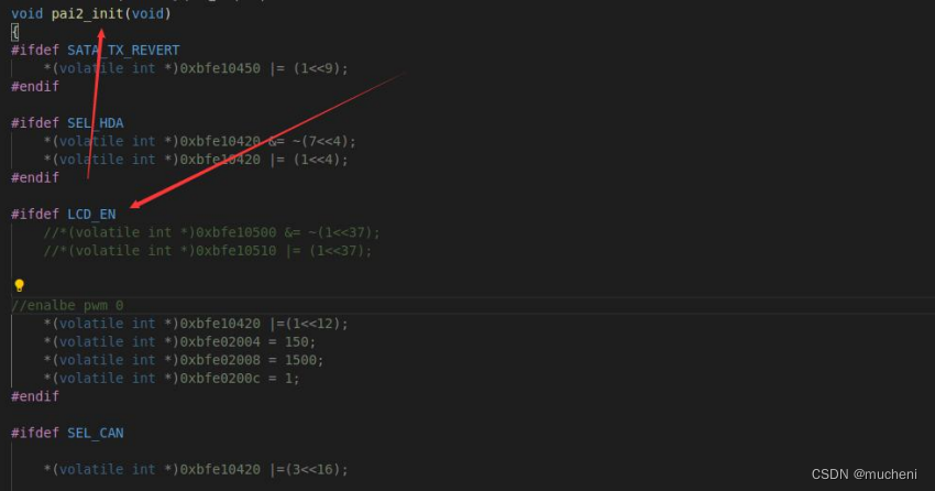 可以看出,屏幕背光使用的引脚为 GPIO37 将这个 GPIO 拉高即可,在 BSP 里面,关于背光的代码其实已经给我们写好了,我们稍加修改即可。我们找到 Targets/LS2K/ls2k/tgt_machdep.c 文件的 tgt_devconfig 函数,在这个函数里面调用了 init_pcidev 函数。而 init_pcidev 函数里面通过宏定义 PAI2 包含了 pai2_init 函数,