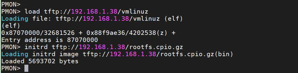 在 PMON 目录下输入命令 load tftp://192.168.1.38/vmlinuz 加载内核到开发板,然后在输入命令 initrdtftp://192.168.1.38/rootfs.cpio.gz 加载文件系统(buildroot 根文件系统),其中 192.168.1.38 为虚拟机 Ubuntu的 IP 地址,如下图所示: