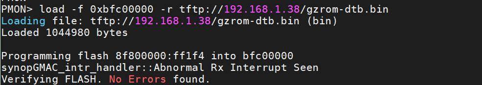 设置完网络后,我们输入命令 load -f 0xbfc00000 -r tftp://192.168.1.38/gzrom-dtb.bin,其中192.168.1.38