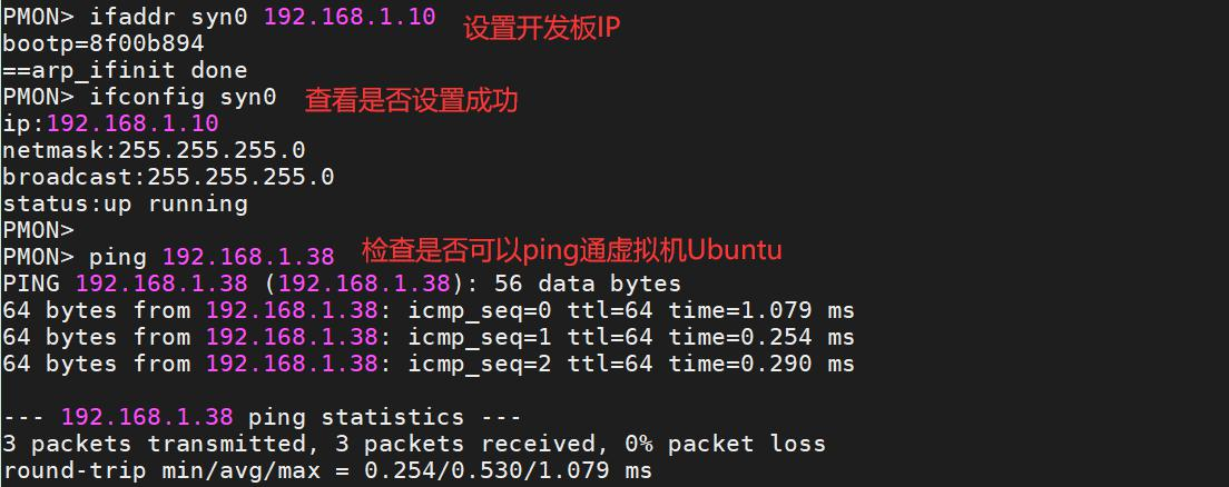 首先,我们需要进到 PMON 命令行下,使用命令 ifaddr syn0 192.168.1.10 设置开发板的 IP 地址和虚拟机 Ubuntu 的 IP 在同一个网段下,并可以 ping 通虚拟机,如下图所示: