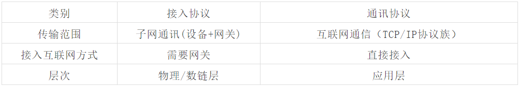 接入协议一般负责子网内设备间的组网及通信,接入协议大多都不属于TCP/IP协议族,只能用于设备子网(设备与网关组成的局域网)内的通讯;传输协议主要是运行在传统互联网TCP/IP协议之上的设备通讯协议,负责设备通过互联网进行数据交换及通信。