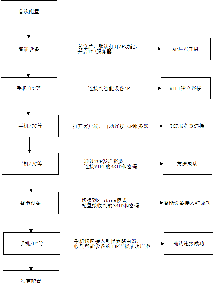 在机器复位后,首先智能硬件会工作在Wi-Fi的AP模式,且开启TCP服务器,进入监听状态。