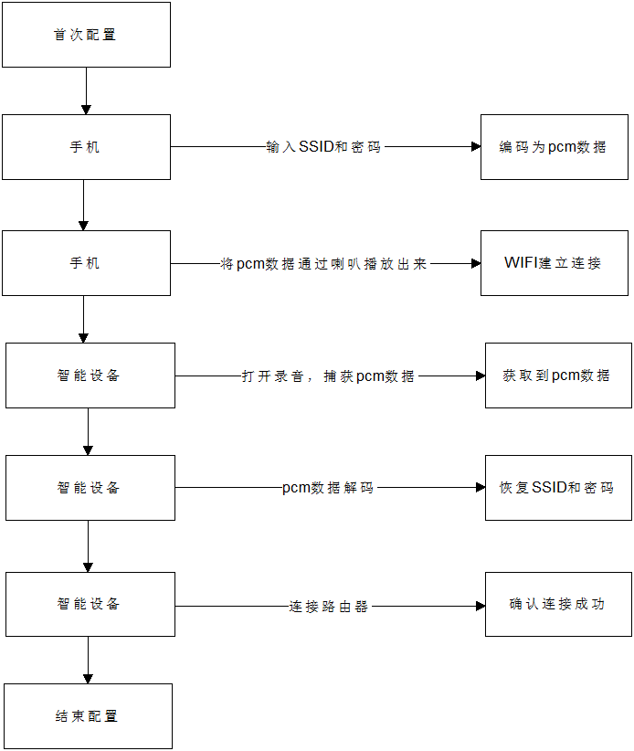 - 首先,在手机(或平板等其它一代设备)输入ssid信息(或获取当前或系统保存的ssid信息),将信息由buffer编码为pcm数据;