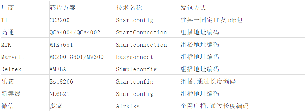 目前市面上常见的多种SmartConfig/SmartConnection技术,虽然各个Wi-Fi芯片方案会取不同的英文名字,但是基本原理则基本相同,只是填充的数据协议格式稍有区别。