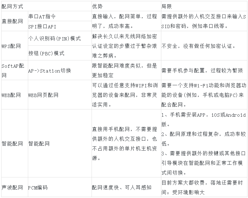 常见的配网方式,可归为如下几大类:直接配网、WPS配网、WEB配网、SoftAP配网、智能配网配网、声波配网。用户可以根据具体的使用场合选择各种最适合的配网方式。