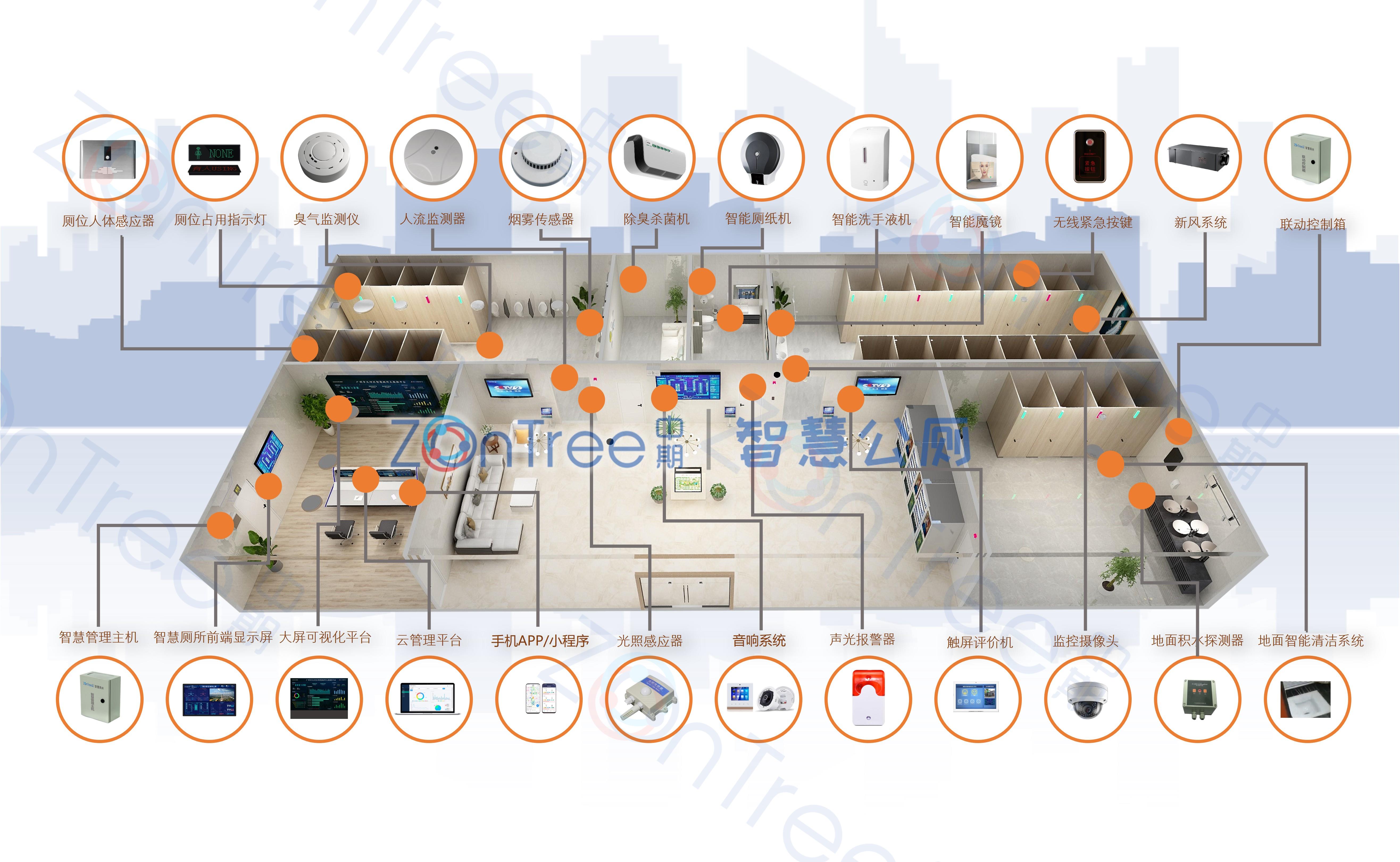 中期科技是一家专业的物联网技术应用厂商,拥有优势的整合能力,通过实现传感感知、物联网、云计算、大数据、区块链、人工智能全方位的技术融合,以及对物联网技术与公厕运营管理需求的良好结合,所规划的中期科技ZONTREE智慧公厕/智慧厕所/智慧卫生间/智慧洗手间解决方案能实现公共厕所的智慧化管理,(中期科技原创,侵权必究)让公共厕所保持洁净、卫生、清新、无异味的良好状态。系统包括厕位智能监测系统、环境监测系统、环境调控系统、资源消耗监测系统、安全防范系统、卫生消杀设备、多媒体信息交互系统、管理联动控制系统等八大系统,数十个传感设备,云端多屏应用软件。(中期科技原创,侵权必究)