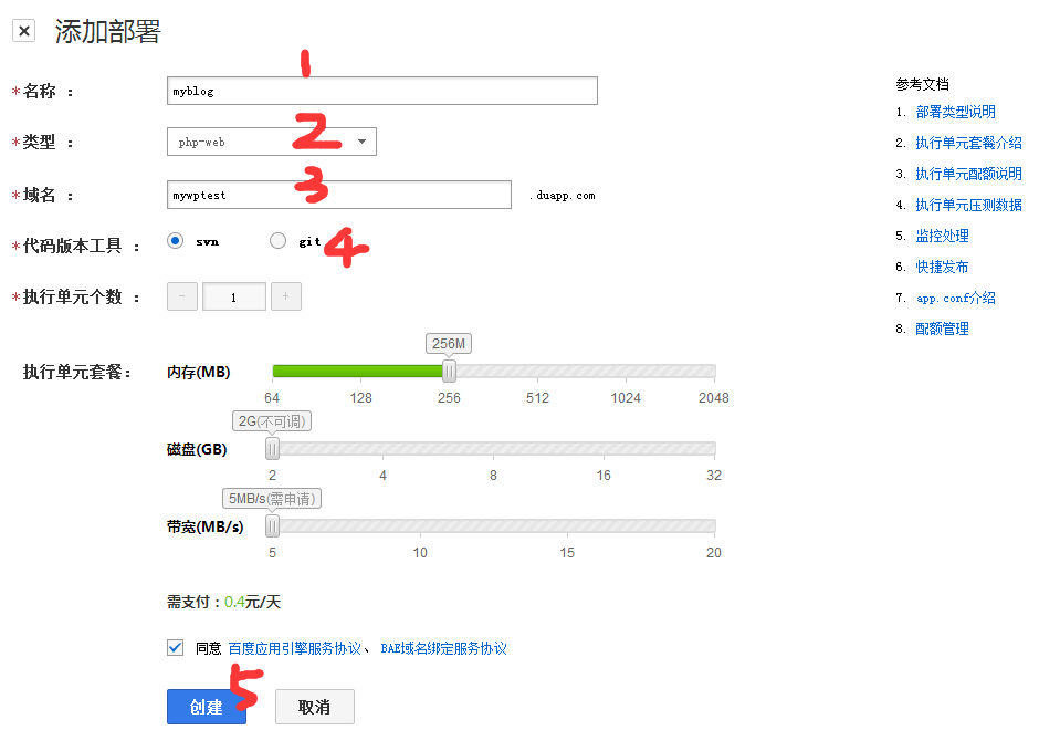 名称依然随便填写,名称和域名可以不相同,域名请好好填呢!类型请选择“php-web”,代码版本工具根据自己喜好选择,这里就选择“svn”,其它默认即可(PS:下方需支付XX元请暂时无视,后面有说明。)