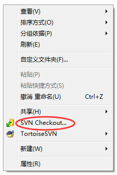 安装完成之后,在本地计算机上新建一个SVN工作文件夹,右击该文件夹选择”SVN Checkout”