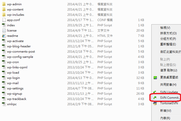 http://cn.wordpress.org/,解压复制WORDPRESS文件夹下所有文件到SVN工作文件夹,