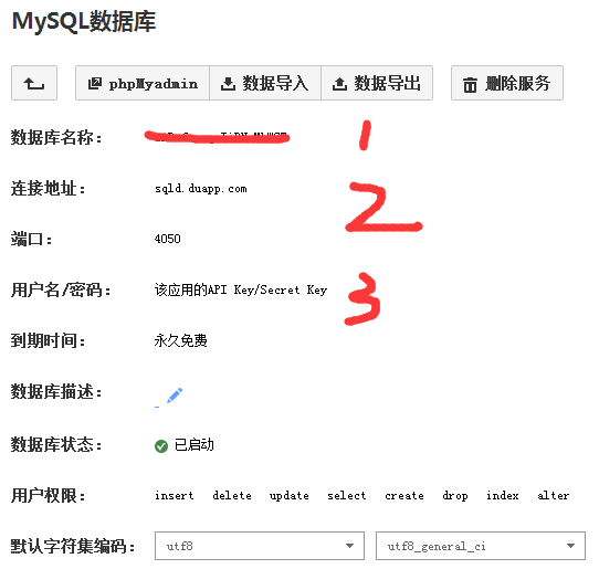 数据库名、数据库用户名、密码、数据库主机,在扩展服务-点进你的WP数据库之后会看见。