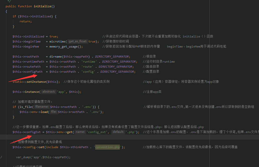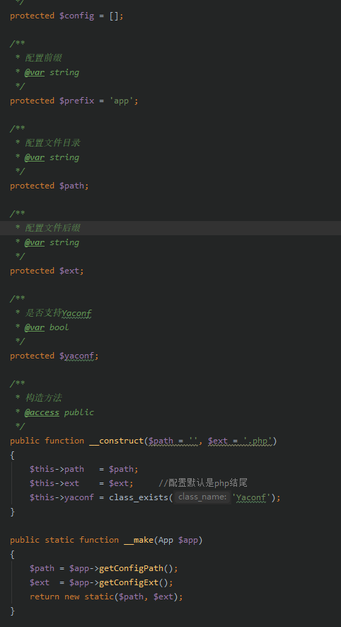 config类是由app容器类加载的,app继承了container类,因此读过容器部分的代码就知道,当config实例化的时候,调用__make函数,将app类中赋值的属性$this->configPath以及$this->configExt注入进config,作为config类初始化的值。相关代码: