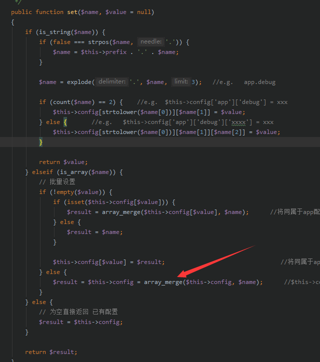 2.读取配置文件,配置文件所返回的数组走到第二大分支的逻辑 is_array($name) ,该场景和第一点一样,是同样的逻辑分支,但它执行的地方是此处: