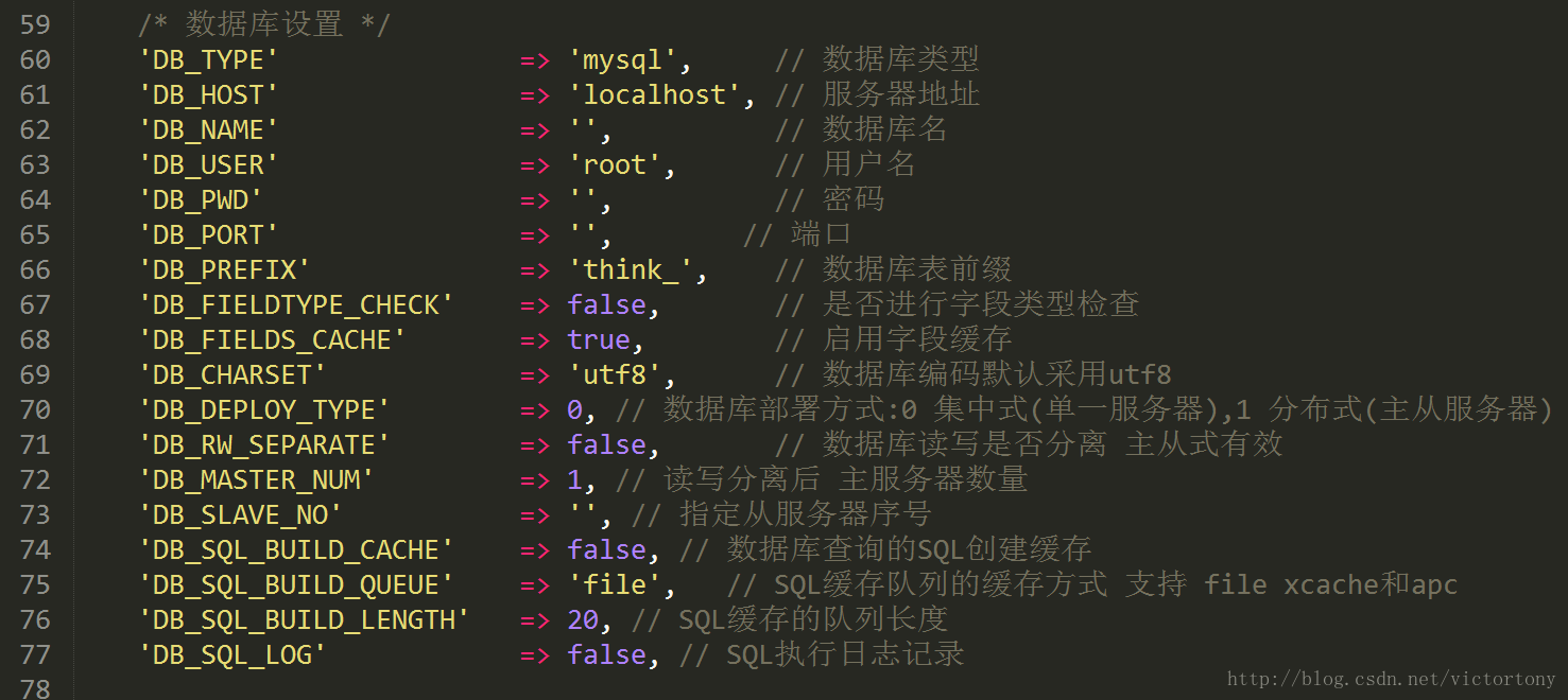 打开项目文件夹下的/ThinkPHP/Conf/convention.php文件,在该文件中,有很多配置项,其中包含了对于数据库的配置,如下图: