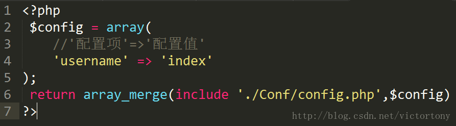 可以看到,我们在$config变量中加入相应项目与其他项目不同的配置,然后与公共配置项合并,并将公共配置项中,相同的配置项覆盖(array_merge函数)。