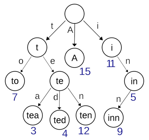 - 字典树,又称为基数树或前缀树,是一种用于存储键值为字符串的动态集合或关联数组的查找树。树中的节点并不直接存储关联键值,而是该节点在树中的位置决定了其关联键值。一个节点的所有子节点都有相同的前缀,根节点则是空字符串。