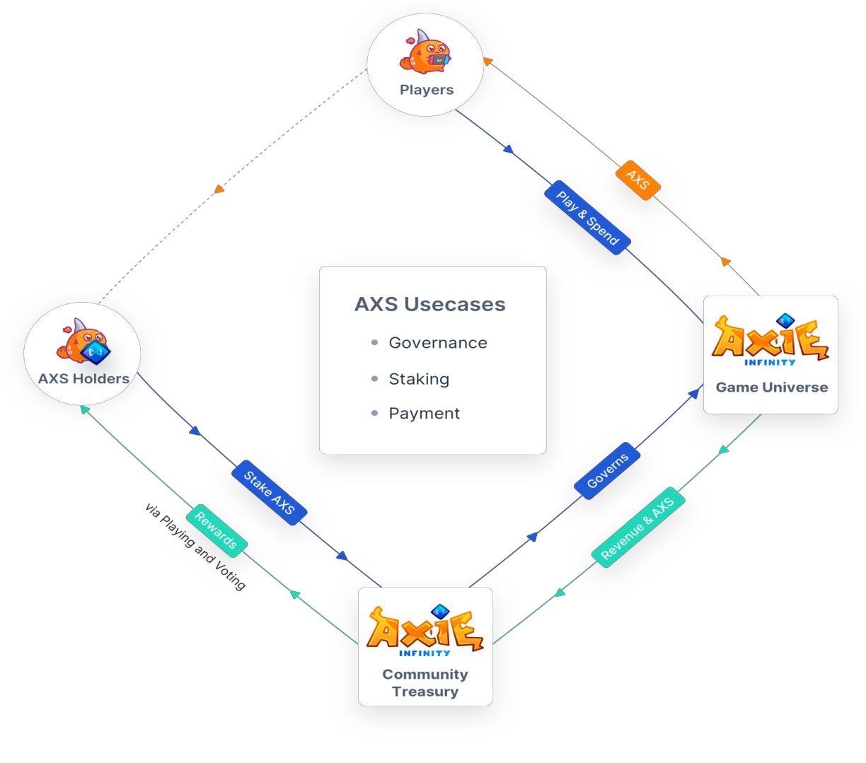 从2021年开始,玩家可以获得治理代币AXS,它代表了游戏世界的一个真实部分,因为它内置了治理权和费用共享。由于玩家可以通过玩游戏来获得此令牌,因此出现了一种就绪型玩家类型的任务,玩家可以在其中真正获得宇宙的一部分。然而,这些任务并不是赢家通吃,而是根据每个玩家的努力和技能来奖励他们。